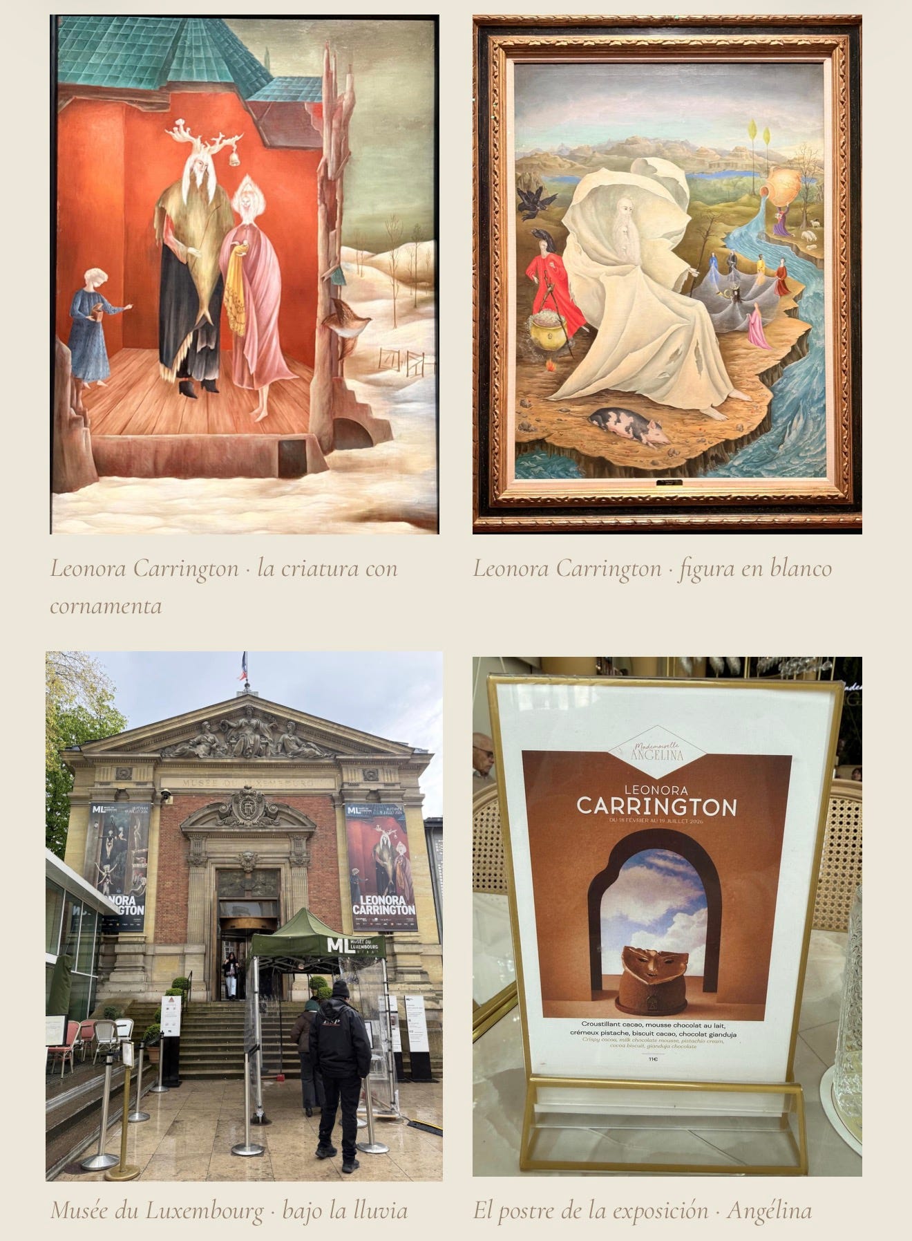 Los carteles flanqueaban la fachada neoclásica: una criatura con cornamenta de ciervo y cabello blanco como nieve de otro mundo, acompañada de una figura envuelta en rosa, descalza sobre tablones de madera. Leonora Carrington miraba desde las paredes como si llevara décadas esperando que alguien llegara bajo la lluvia a hacerle preguntas.