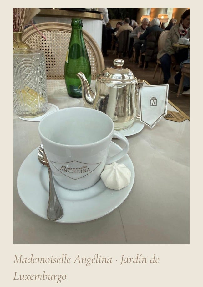 Salí de la exposición y crucé hacia Mademoiselle Angélina, ese salón de té adosado al museo como un secreto bien guardado. Me senté. Llegó una tetera en su brillo plateado que parecía haber sobrevivido varias guerras, una taza blanca con el nombre impreso en dorado, una pequeña merengue de nada.